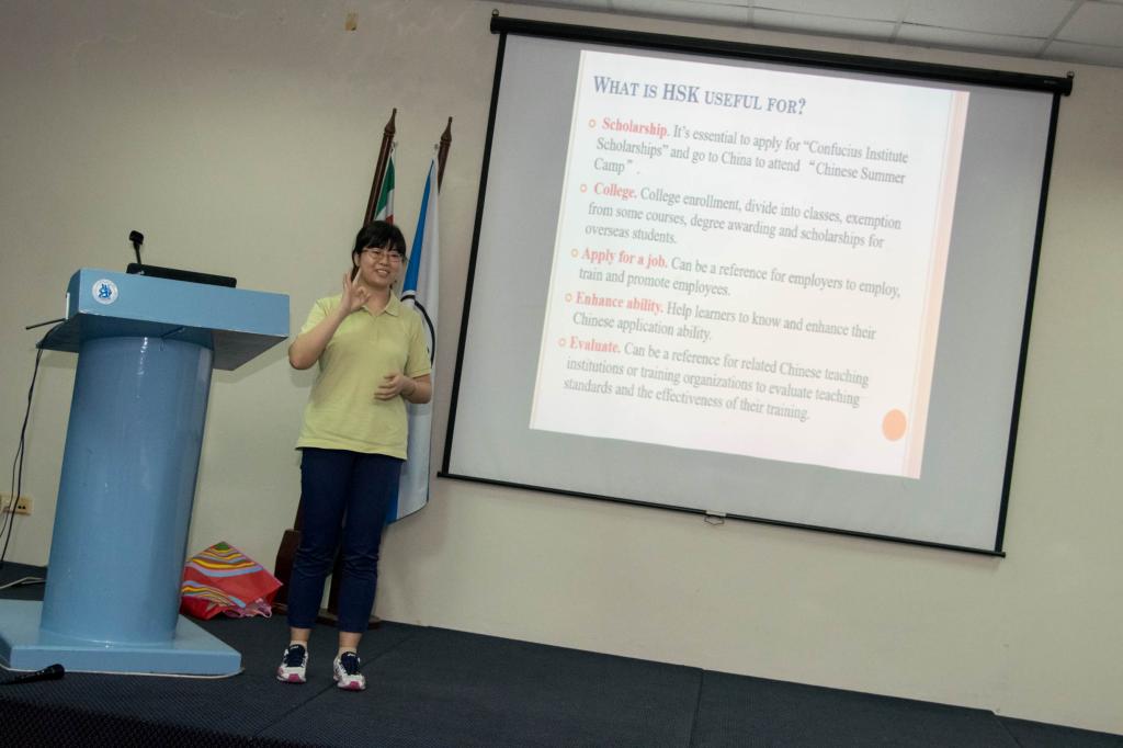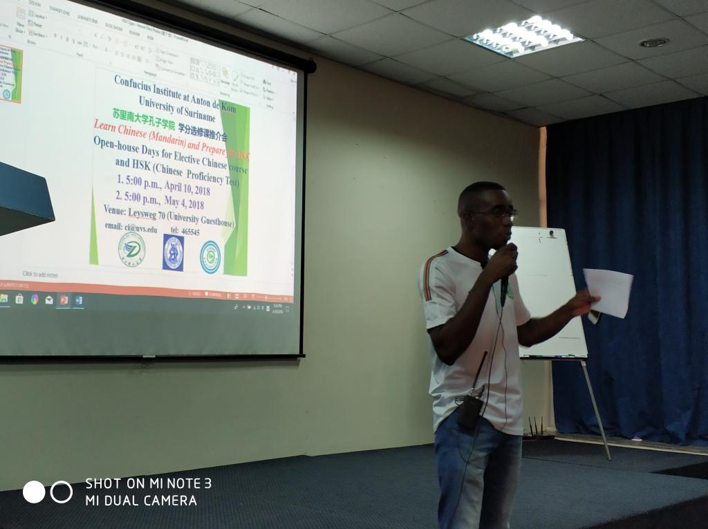 此次宣讲对象为苏里南大学学生、孔院学员及其他有志于参加汉语学习和HSK考试的人员。首先,中方院长林劲简要介绍了孔子学院汉语课程设置和HSK的基本情况。接着,孔院专门邀请的留华回国留学生Harvey Blom与大家分享了自己学习汉语的体会。他讲述了在清华大学的留学经历,并以打车和购物为例,生动地展示了汉语在学习、工作和生活中的重要性,以此鼓励在场人员学习汉语。其风趣幽默的演讲得到了大家热烈的掌声。随后,我校的公派教师刘哲博士介绍了HSK考试构成、考试级别和相应的要求以及HSK证书在留学中国、就业等方面的作用,鼓励大家积极参加考试。刘哲博士还通过让来宾们猜测象形文字的意思来说明现代汉字的起源,激发了来宾们对学习汉字的强烈兴趣,也打消了部分来宾认为汉语很难的疑虑。此外,外方院长Preetema女士介绍了HSK考试与苏里南大学学分课的关系等。宣讲会后,参会人员还积极咨询了相关内容,孔子学院的老师们都予以耐心解答。